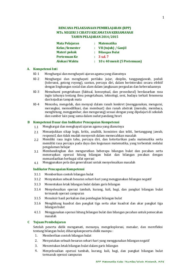 Rpp Matematika Kelas 7 Kurtilas Semester 1 2014 2015